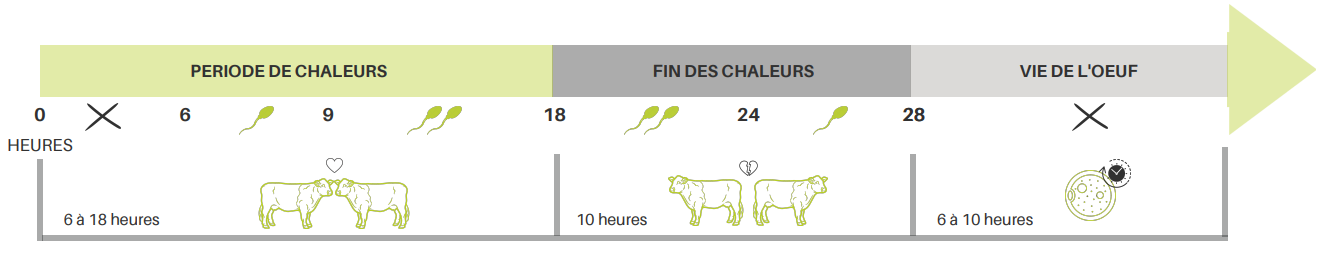- Les spermatozoides survivent de l'ordre de 24h après l'insémination. L'ovule reste fécondable 8 à 12h et n'est libérée que 6 à 14h après la fin des chaleurs.